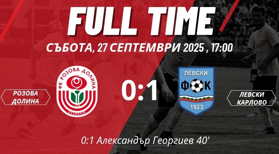 Левски (Карлово) спечели дербито на Розовата долина, след като надигра с 1:0 като гост Розова долина (Казанлък). „Сините“ спечелиха първата си победа като гост този сезон в 9-тия кръг на Югоизточната Трета лига.